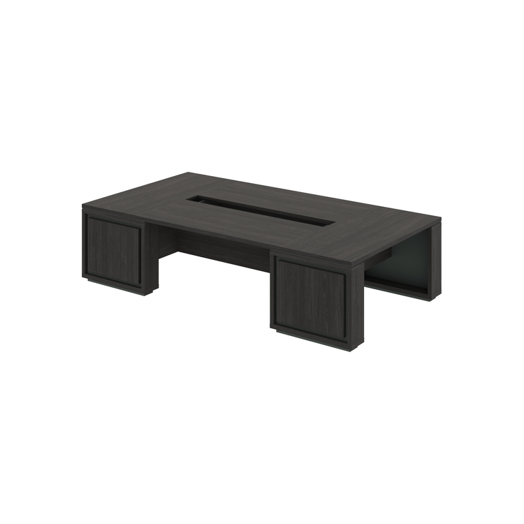 Столешницы, фронтальные панели, верха, низы и бока опор выполнены из ЛДСП Дуб Шерман антрацит 38 мм, облицованы противоударной кромкой ABS 2 мм. Соединители стола выполнены из ЛДСП Дуб Шерман антрацит 18 мм, видимые торцы облицован противоударной кромкой ABS 0,8 мм. Соединители опор выполнены из ЛМДФ Зеленый камень 18 мм с поверхностью PerfectSense Matt с лицевой стороны. Опоры установлены на цоколя из ЛДСП 38 мм, облицованные противоударной кромкой ABS 2 мм в цвете Зеленый камень. Между столешницами и опорами - проставки из ЛДСП 8 мм, заглубленные на 4 мм от краев столешницы и опор, и, облицованные противоударной кромкой ABS 1 мм PerfectSense Matt.